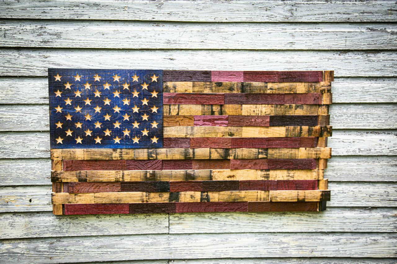 The flag pictured here is an example of how your flag may look, however, it is not the flag you will receive. Markings and coloring may vary due to the uniqueness of each barrel stave. Some barrel staves may have barrel stamps or other elements from their years of use in making wine and whiskey. The color on the barrels is varied, rich and deep.