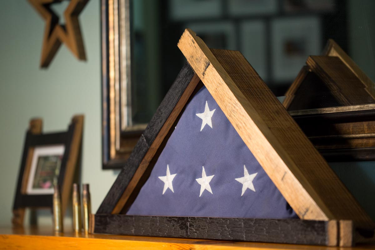 Flag display case with detail handcrafted using barrel staves by people who take pride in their work. They are also aware of the importance you hold in the treasured symbol you will display in their product.